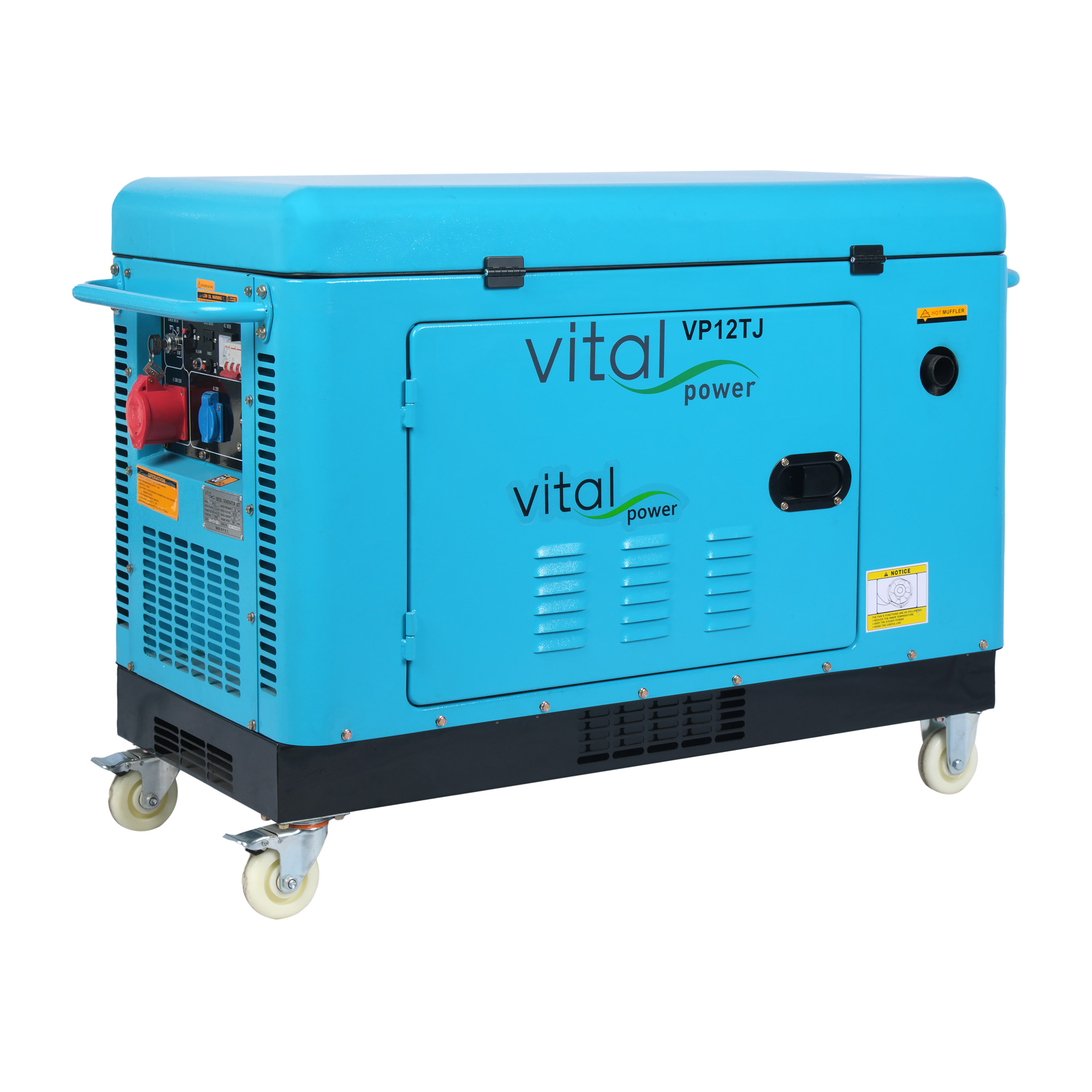 With a power output of 12 kVA, our VP12TJ model combines performance and portability in an elegant design. It offers environmentally friendly, quiet operation with low decibel levels, superior mobility thanks to its practical wheels, and consistently high performance even under demanding conditions.